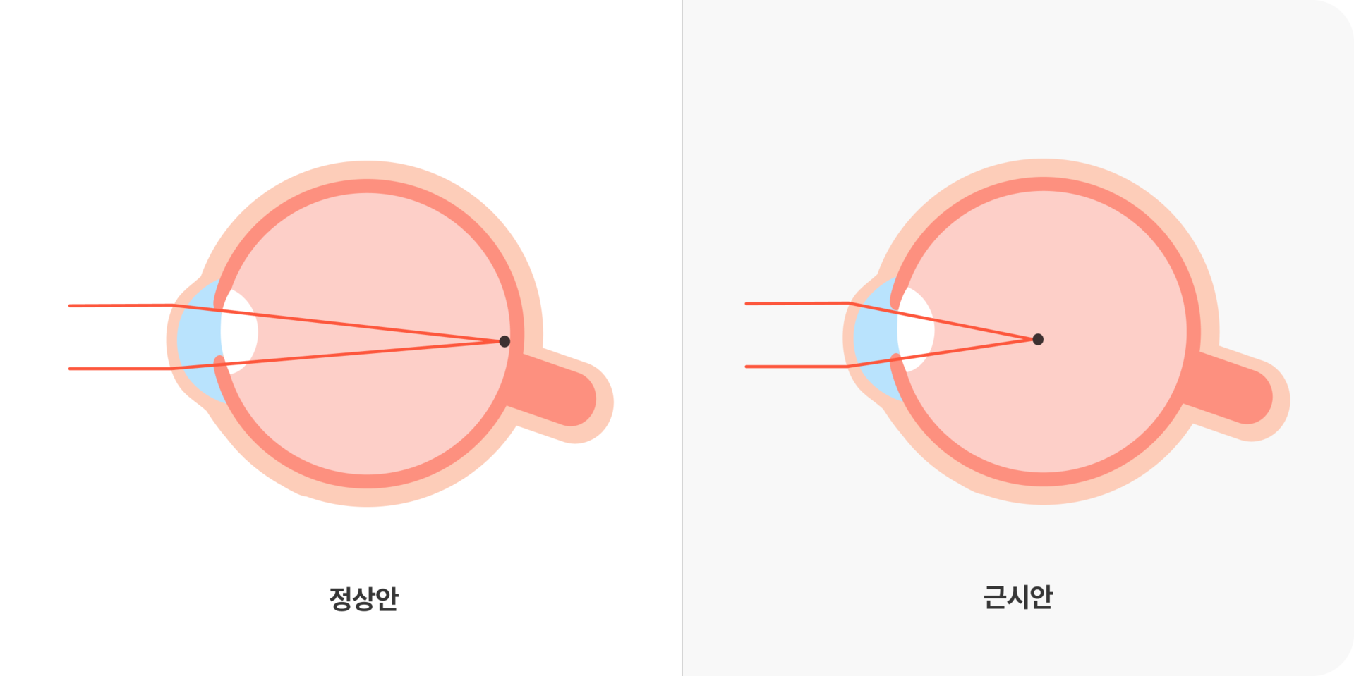 근시는 물체의 상이 망막의 앞쪽에 맺혀 먼 곳은 잘 안보이고 가까운 곳이 잘 보이는 굴절 이상을 말합니다.국내 소아들의 굴절이상 중 가장 많은 비율을 차지하고 성장하면서 계속 진행될 수 있는 질환입니다.